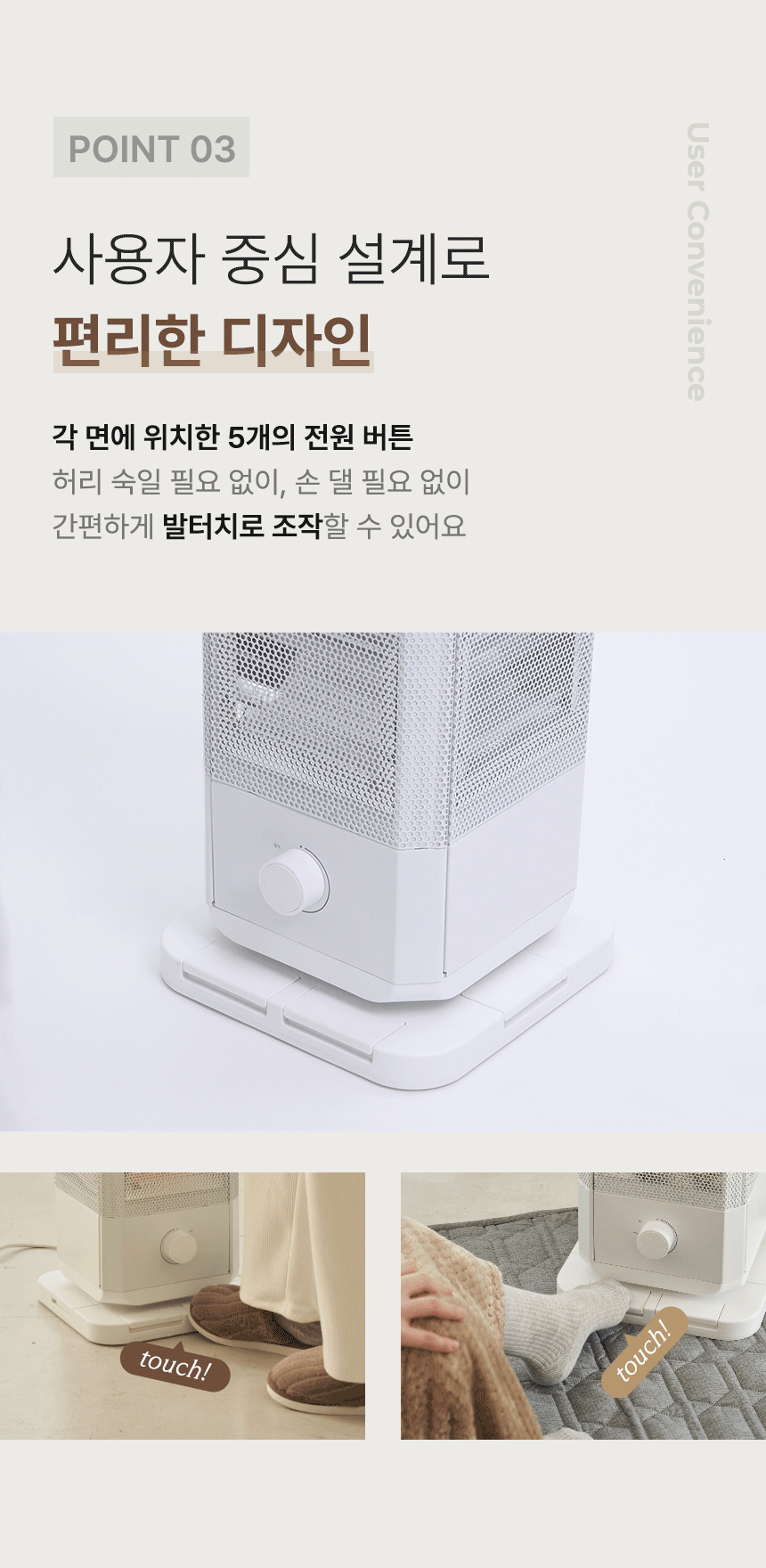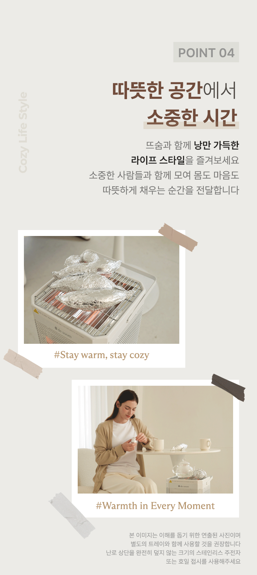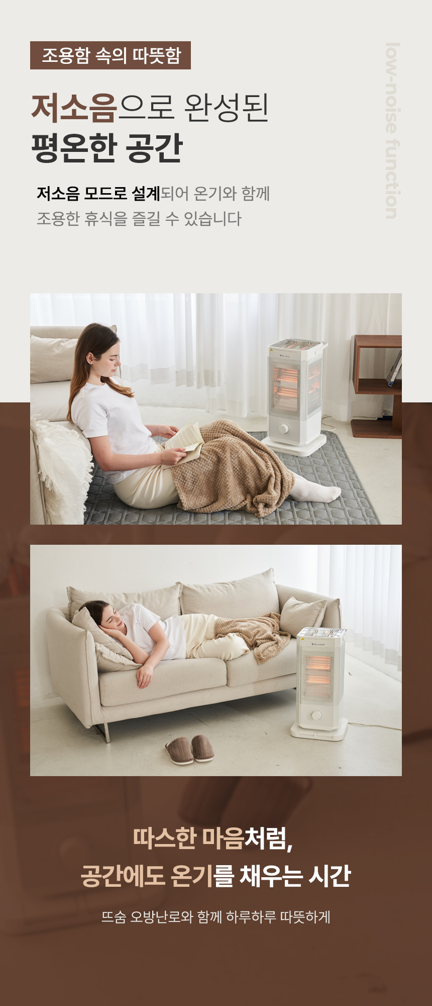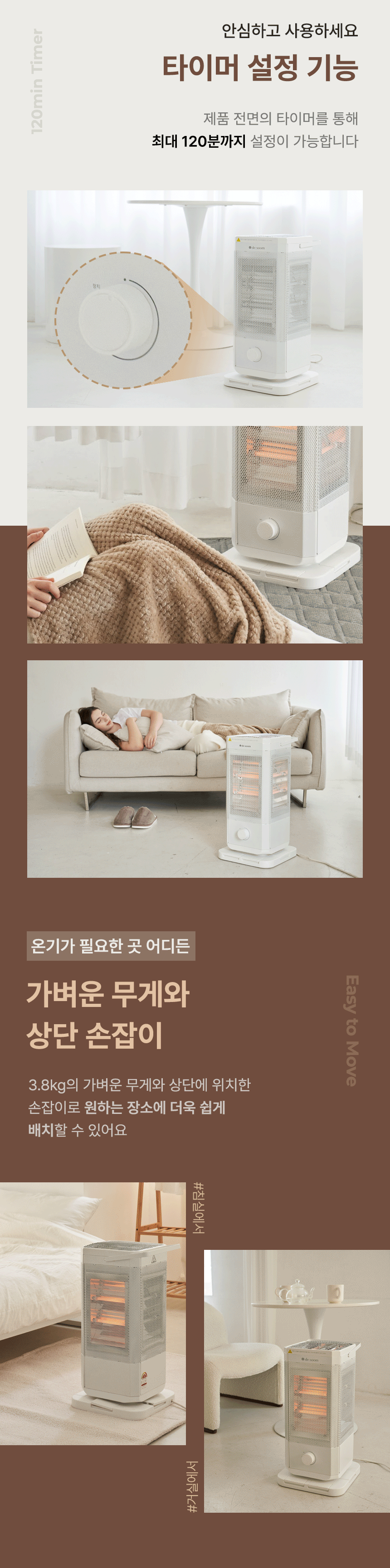 전체적으로 파스텔 우드톤을 메인으로 사용해 따뜻하고 아늑한 분위기를 연출했습니다. GIF 이미지를 활용하여 제품의 주요 기능을 눈에 띄게 전달하여 시각적 주목도를 높였습니다. 중간중간 사용된 세리프 서체는 고급스럽고 우아한 느낌을 더하고, 소비자들에게 품질과 세련된 이미지를 전달하는 데 중점을 두었습니다.