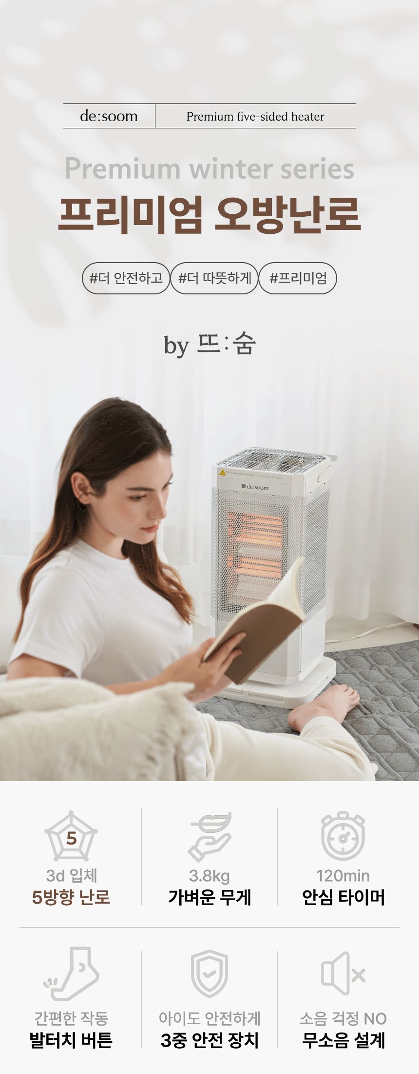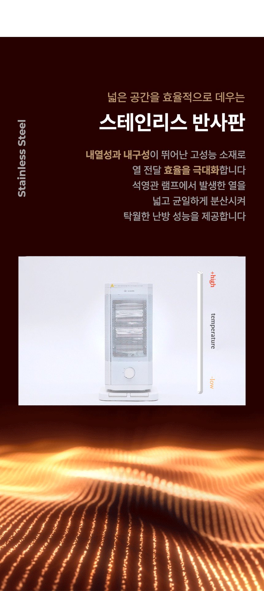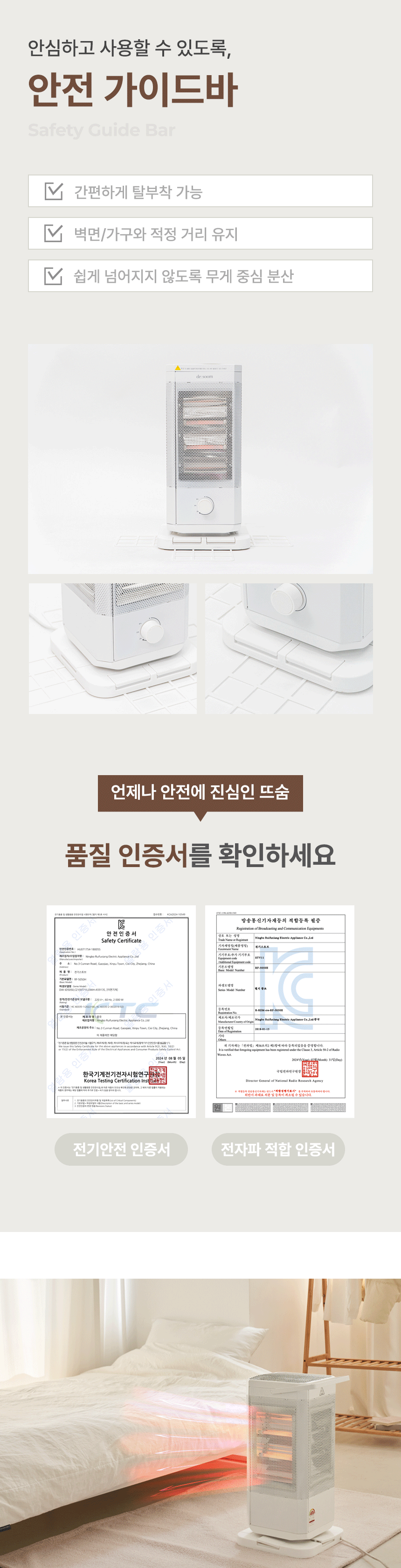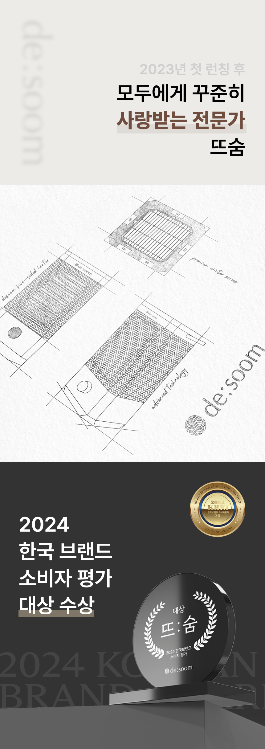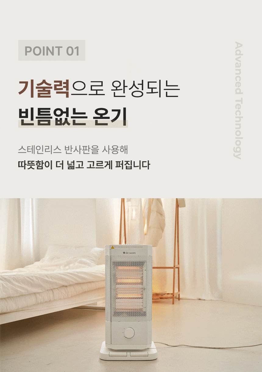 전체적으로 파스텔 우드톤을 메인으로 사용해 따뜻하고 아늑한 분위기를 연출했습니다. GIF 이미지를 활용하여 제품의 주요 기능을 눈에 띄게 전달하여 시각적 주목도를 높였습니다. 중간중간 사용된 세리프 서체는 고급스럽고 우아한 느낌을 더하고, 소비자들에게 품질과 세련된 이미지를 전달하는 데 중점을 두었습니다.